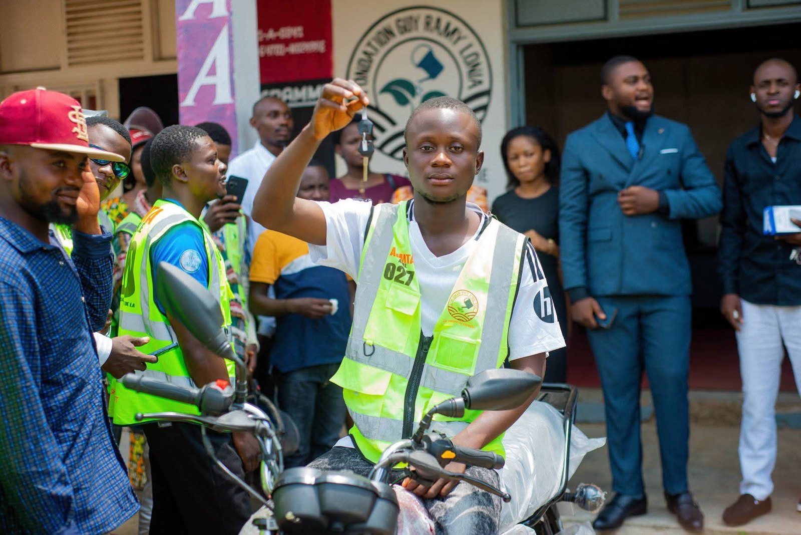 Juste après la remise des enveloppes, c’était au tour des jeunes de l’Association des Jeunes Motards de la Tshopo Autrement (AJMTA) de recevoir un soutien tangible. L’un des membres s’est vu offrir une moto neuve de marque TVS. Un geste fort qui symbolise l’appui de la fondation envers les jeunes taximen de la ville.